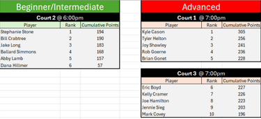 Points are tracked for individual players and are cumulative for the six-week period. Places are determined by taking a player’s total points earned divided by their total points possible, rendering a point percentage.